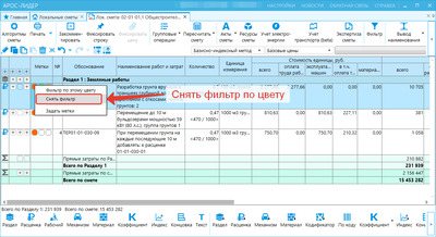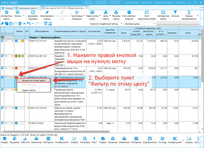 3) Выбранный цвет закрепляется за сметной строкой. Так вы всегда сможете легко найти отмеченные вами строки. 4) Для отображения на экране только строк, по выбранной цветовой метке, нажмите на метку правой кнопкой мыши и выберите пункт «Фильтр по этому цвету». На экране будут отображены сметные строки, отфильтрованные по выбранному цвету.