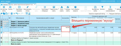 4. В поле «Объем» (Количество) работ по вывозу мусора впишите переменную «мусор» (без кавычек) и нажмите клавишу Enter (Ввод) на клавиатуре.