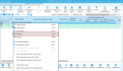 3) В окне локальной сметы программы «АРОС-Лидер» нажмите правой кнопкой мыши и выберите пункт Вставить. В смету добавятся все расценки из документа Excel.