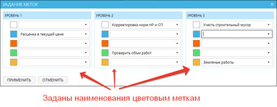 8) У цветовых меток три категории (по количеству возможных цветов для каждой сметной строки). Каждому цвету в каждой категории можно задать наименование. Задайте нужным меткам наименования и нажмите «Применить».