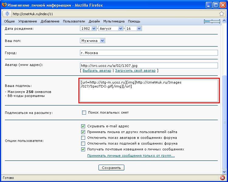 3. Скопируйте код ссылки в статье "Кнопки пользователей" и вставьте его в окне "Ваша подпись".
