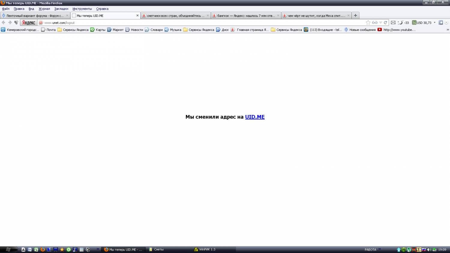 Добавлено (13.12.2012, 08:30) --------------------------------------------- Нет, все- таки что-то не то с сайтом творится. После того, как нажимаю на "Выход" (чтобы из участников перейти в статус Гостя), меня вообще вышибает с сайта. Пустой экран открывается, а в адресной строке при этом появляется: http://www.unet.com/logout