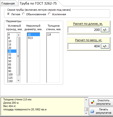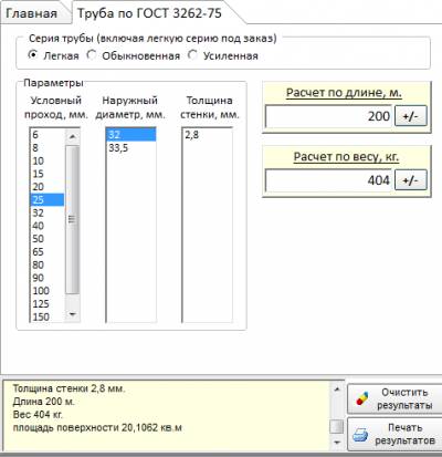 Добавлена возможность выбора типоразмера труб по ГОСТ 3262-75 по различным параметрам