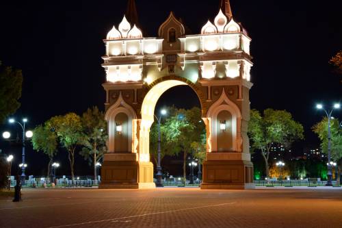 Благовещенск. Триумфальная арка. Надпись на арке "Земля Амурская была, есть и будет Русской".