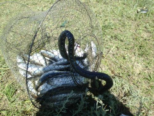 Ловим рыбку, глядь - в садок попытался забраться уж и застрял...