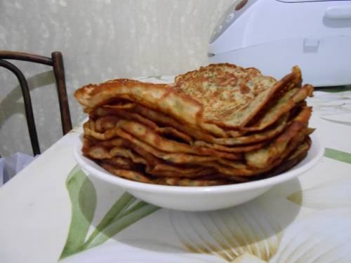 Яйца взбить миксером с солью и сахаром в крепкую пену, влить молоко, добавить муку и разрыхлитель, еще раз взбить. Сыр натереть на среднюю терку (я делала на мелкой). Зелень укропа мелко порезать. Всыпать сыр и измельченную зелень, влить масло и еще раз хорошо перемешать миксером или венчиком. Выпекаем как обычно на сковородке, смазанной маслом. От себя добавлю - укропу предпочла бы петрушку, но к сожалению в магазине ее не оказалось. Что понравилось - проблем с прилипанием, переворачиванием совершенно нет.