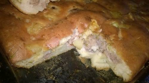 Кефир перемешиваем с содой и оставляем минут на 5. Затем добавляем остальные ингредиенты и хорошо перемешиваем. Смазываем форму маслом, посыпаем мукой и выливаем половину теста. Выкладываем подготовленную начинку и выливаем на неё вторую половину теста. Ставим