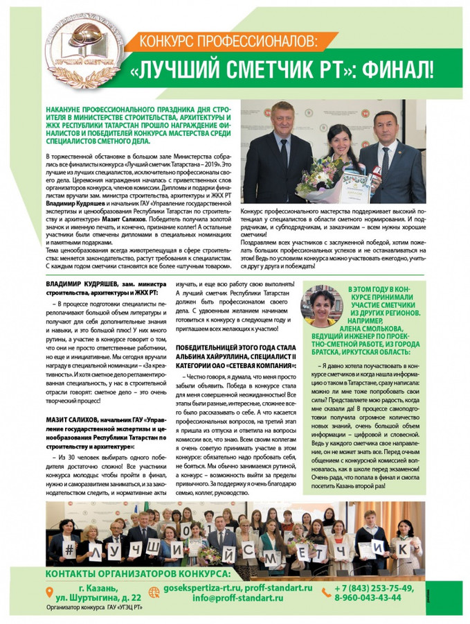 Печатные издания 1. Новость в журнале «Строители Татарстана» № 1 (109), январь-февраль 2019 2. Публикация в информационно-аналитическом журнале «Республика. XXI век», январь-февраль 2019 3. Новость в журнале «Стройэкспертиза» № 1 (8), январь – февраль 2019 4. Публикация в информационно-аналитическом журнале «Республика. XXI век»: повышаем профессионализм, март 2019 5. Вестник ценообразования Республики Татарстан, 1 квартал 2019 6. Вестник ценообразования Республики Татарстан, 2 квартал 2019 7. Публикация в журнале «Телесемь»: профессия будущего – сметное дело, № 30, 29 июля - 4 августа 2019 8. Публикация в журнале «Телесемь»: конкурс профессионалов: «Лучший сметчик Республики Татарстан», № 31, 5 - 11 августа 2019 9. Публикация в журнале «Телесемь»: с Днем строителя, № 32, 12 - 18 августа 2019 10. Публикация в журнале «Стройэкспертиза. Республика Татарстан»: победа близка, № 03(10) 05.2019 11. Публикация в журнале «Телесемь»: конкурс профессионалов: «Лучший сметчик РТ: финал», № 34, 26 августа - 1 сентября 2019 12. Публикация в журнале «Стройэкспертиза. Республика Татарстан»: в Минстрое наградили лучших сметчиков, № 06(13) 08.2019
